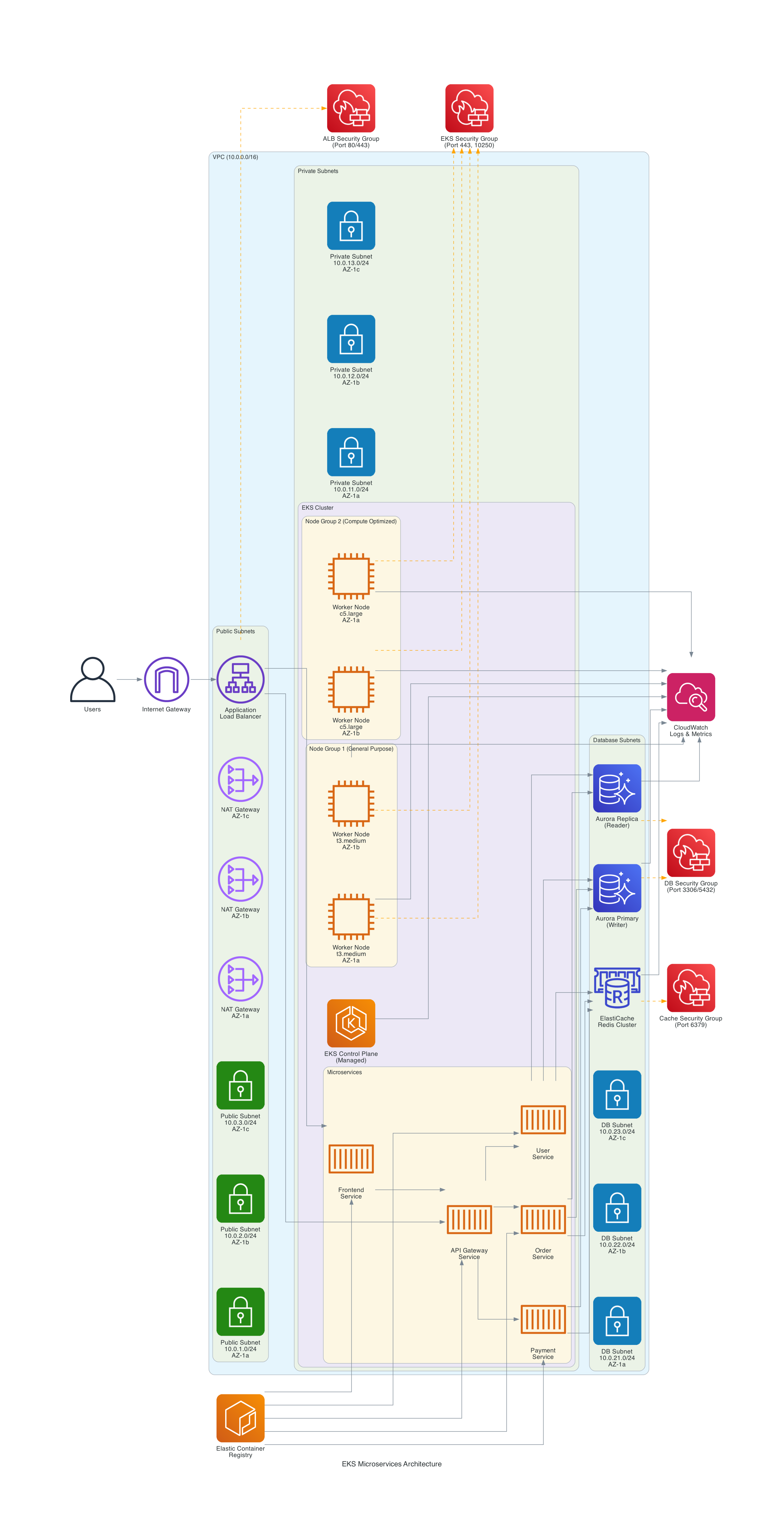 database and cache layers. The orange dashed lines represent security group