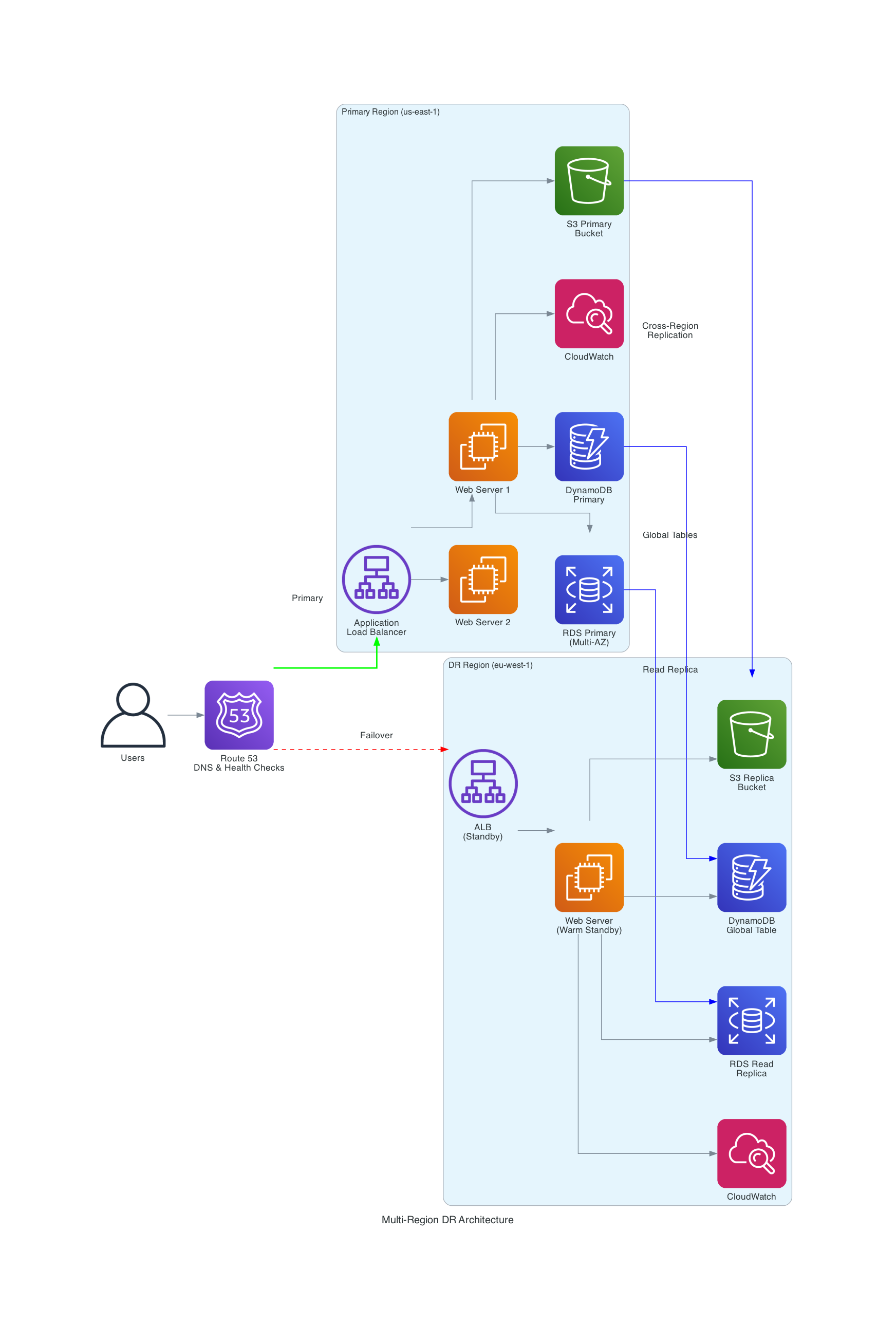 Generate diagrams showing your DR setup, including cross-region replication, backup strategies, and failover processes.